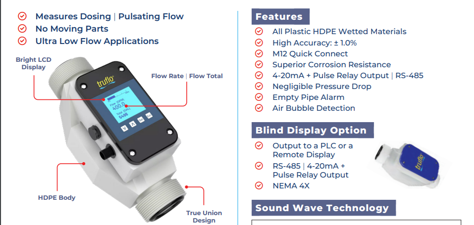 The Ultraflo 2000 ultrasonic flow meter sensor is designed to measure the volume of clean liquid media using sound wave technology. The Ultraflo 2000 can measure both conductive and non-conductive liquids. The Ultraflo 2000 ultrasonic flow meter sensor emits 250 sound pulses/min making it an excellent choice for measuring dosing and pulsating flow rates. There are no moving parts and the full port design equates to a negligible pressure drop. The unique body design minimizes dead space over the whole geometry. All wetted parts in contact with the medium are constructed of virgin HDPE material. The Ultraflo 2000 is characterized by its high repeatability and excellent measurement accuracy.