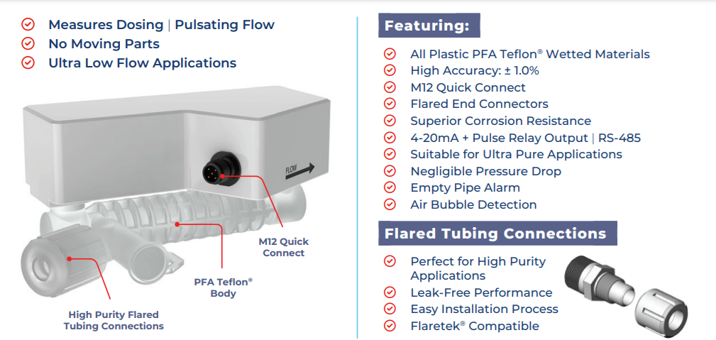 The Ultraflo 1000 Ultrasonic Flow Meter Sensor utilizes ultrasonic technology to measure both conductive and non conductive liquids, and is an excellent choice for very corrosive liquids such as strong acids and alkalines. The UltraFlo 1000 has no moving parts and can measure pulsating, dosing and metering flow applications. All parts that contact the liquid are made of corrosion resistant PFA Teflon®. The UltraFlo 1000 Ultrasonic Flow Meter Sensor is characterized by its high measurement accuracy and repeatability. approximately 5 business days.