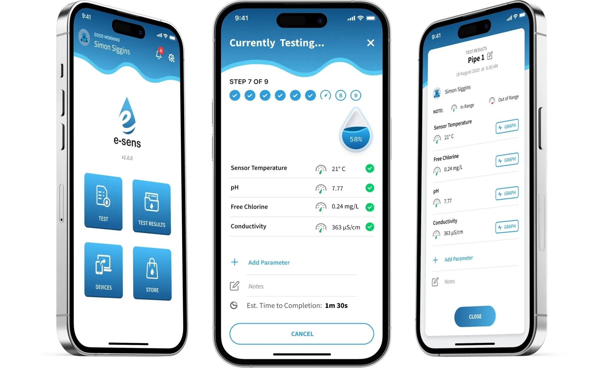 e-sens manufactures a new generation of hand-held instruments that dramatically simplifies the process of testing water quality. Combining silicon-based sensors with powerful microfluidics, the e-sens device eliminates cumbersome solutions and reagents and increases accuracy through auto calibration and minimal user interaction. Over 20 different water quality parameters can be transmitted to any mobile device.at the touch of a button.